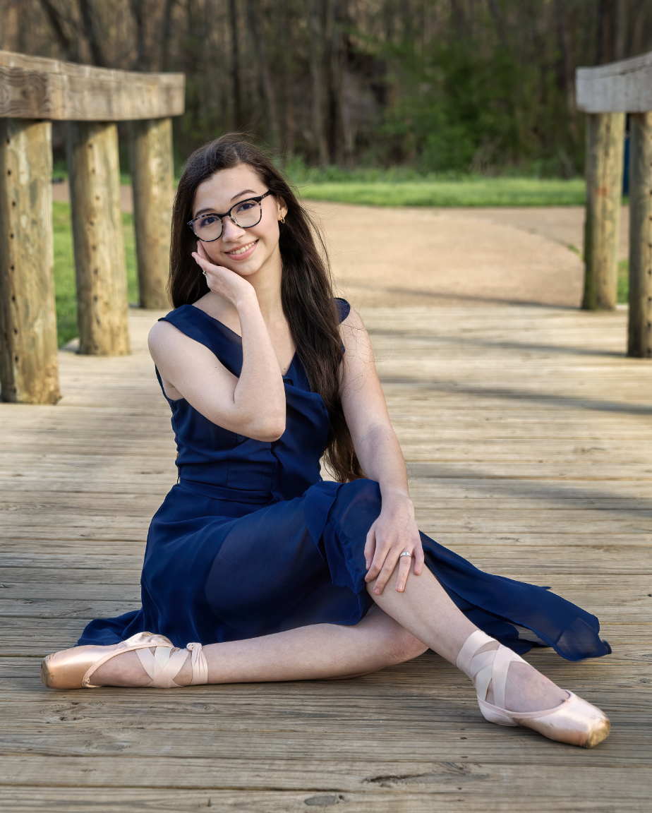 A young woman with long dark hair, wearing glasses and a blue dress, sitting on a wooden bridge with one leg extended and the other bent, wearing ballet shoes, with a background of trees and a dirt path.