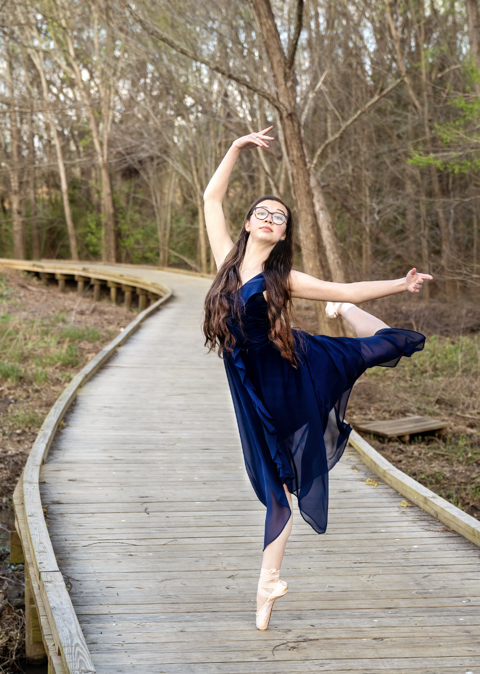 A ballerina in a navy blue dress dancing on a winding wooden pathway in a wooded area.